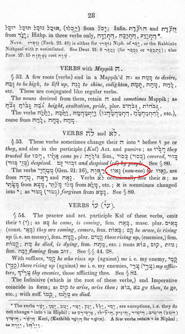 Nauvoo is in fact a real Hebrew word. It appears in Isaiah 52:7 and Song of Solomon 1:10. It is the pilel form of the verb na’ah; in modern transliteration we would write it na’wu. It means “to be comely.” Joseph gave the word in the Sephardic transliteration system he learned from Joshua Seixas; in fact, the word Nauvoo is given in the Seixas grammar (see below).