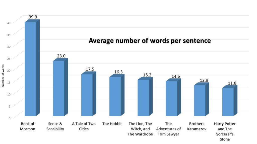 The average length of the sentences in the 1830 Book of Mormon of 39.3 words is nearly double that found in popular literature.[7]