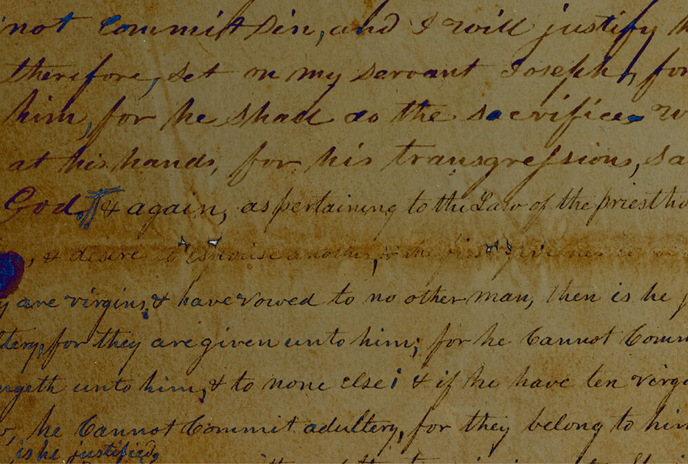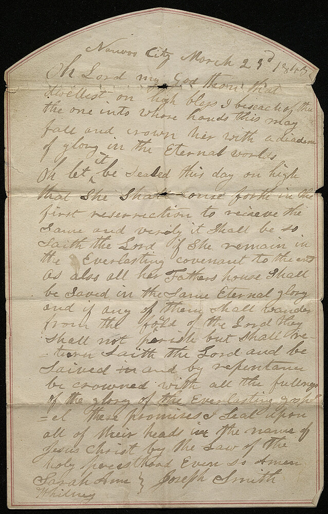 A blessing to Sarah Ann Whitney, in Joseph’s handwriting, is one of the rare evidences of his plural marriages. Sarah was sealed to Joseph by her father, Newel K. Whitney, in 1842. On March 23, 1843, Joseph wrote her a blessing on stationery that he apparently received from the Whitney house. “This document, along with a select few other records likely important to the family, was isolated from that larger collection, suggestion that Sarah Ann, her mother, and other family members assigned those select documents a special status.”