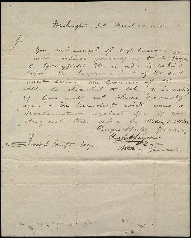 Joseph dealt with a couple of forgeries during this time period. One was a letter received that was supposed to appear as if it were written by the United States attorney general. It instructed Joseph to turn himself in to the Illinois governor for high treason, and he would then be tried by the United States Supreme Court. It threatened that if this didn’t happen, President John Tyler would have him arrested. The letter was recognized as a forgery since it was not in the handwriting of the attorney general and showed ignorance of legal procedure and federal court jurisdiction. It also was not postmarked, so was not mailed.