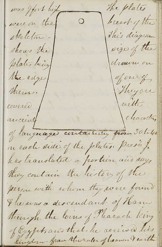 The other forgery was the Kinderhook Plates, though it was not known for sure that they were fake until 1980 (the finding was announced shortly thereafter in the Ensign magazine). A letter including a traced outline of one of the plates is included in this volume. The plates were manufactured and planted in a mound by men that were apparently attempting to trick local church members into accepting them as evidence of the Book of Mormon. The plates made their way to Joseph Smith, and although there are accounts that he made a brief preliminary attempt to translate them, there is no evidence that he had any further interest. (For more information, see the Church History Topic and Don Bradley’s 2011 FAIR Conference presentation.)