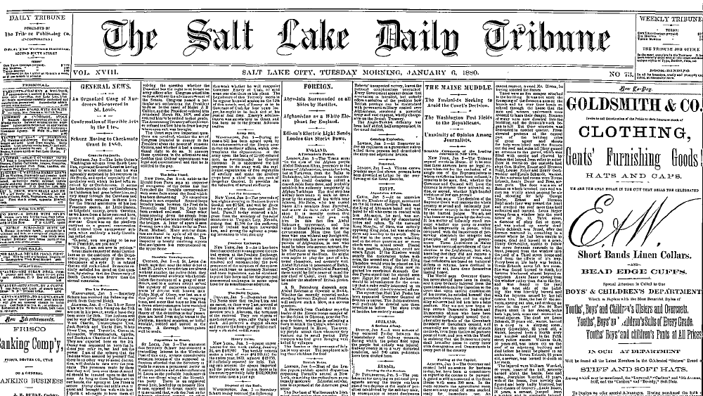 The Salt Lake Tribune was started in 1870 by three men that had left the Church. It changed hands many times but was overtly anti-Mormon until 1901, when its new owners began changing its tone somewhat. During those first 30 years, much of the reporting on the Church was downright obnoxious, and probably not meant to be taken seriously. This includes the article on page four of the January 6, 1880 issue, about a stake conference that took place the previous Sunday. (The available scan of the newspaper page is very difficult to read. In my transcription I used “(?)” after words that I thought were correct but wasn’t completely sure, and I used “[?]” in place of words I found completely unreadable.) It begins with: