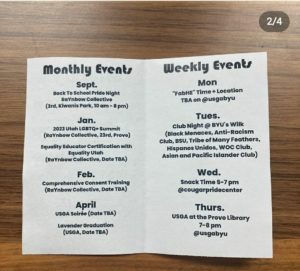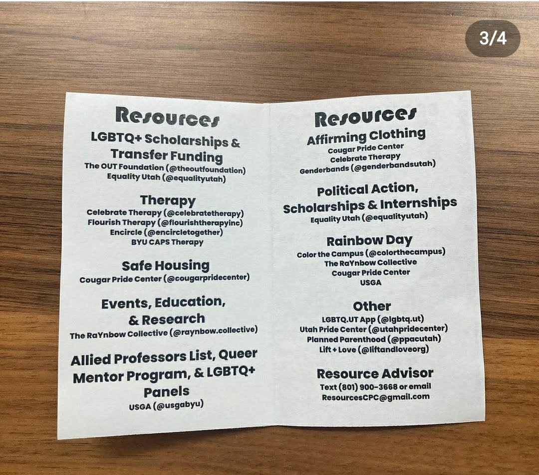 The Deseret News reports, the pamphlet includes “information about campus resources for LGBT students, such as counseling.” However, there are only a select few BYU resources included on the pamphlet that are official: the University’s Counseling and Psychological Services for therapy, and “Club Night” at the Wilkinson Center on Tuesdays (although the latter event specifically includes the “Black Menaces” along with official ethnic organizations, so it’s not exactly a great example of a “campus resource”).