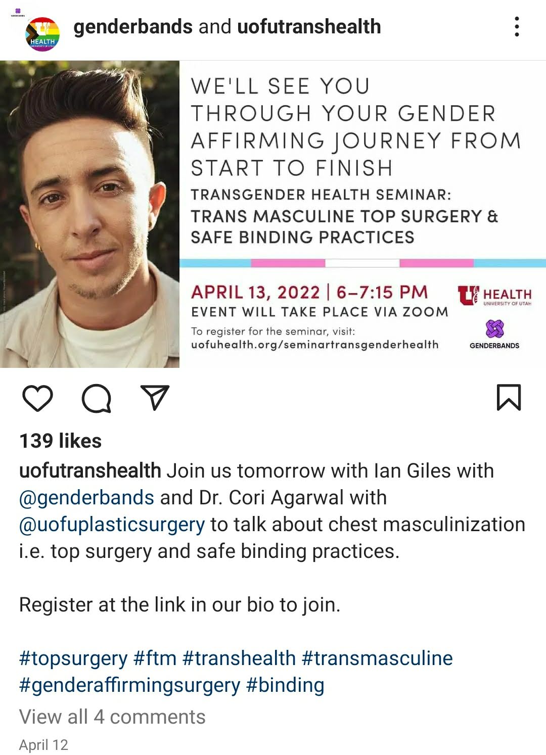 The Genderbands grants are sponsored by surgery clinics, who no doubt calculate they’ll gain more paying customers through this charitable exposure. And if a confused and distressed BYU student is interested in surgery, but doesn’t know enough about it yet? Genderbands touts seminars with surgeons to talk you into it: