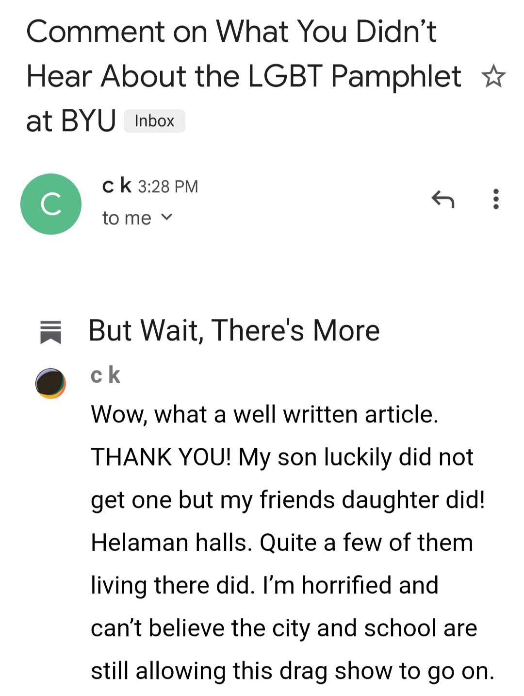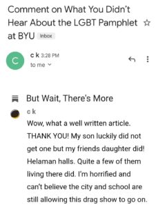 It’s completely horrifying that the groups who produced the “resource” continue to have some access to BYU administration and presence on campus. BYU students should be plainly warned of the dangers of these groups. This is a serious, deeply disturbing incident. The activists behind it should never again be treated as trustworthy or benign. Their leaders should be expelled and prevented from ever distributing materials on campus again.