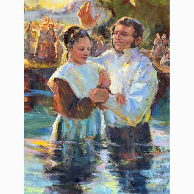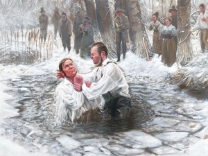 The second artist commissioned for the conference, Sam Day, created a piece inspired by Wilford’s baptism, sharing that his work is “a declaration of [his] faith.”6 The piece he created was called “I did not feel the cold,” and it depicts the historically accurate scene of Wilford being baptized in a frozen river. For more information on Sam Day, visit his website, samday.com. Some of the artwork was available for sale in an online auction, with all proceeds benefiting the Wilford Woodruff Papers Foundation.