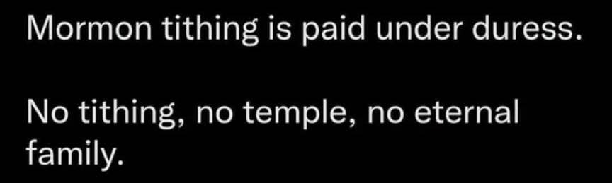 This is an excellent example of propaganda. It’s a claim made about the church that attempts to elicit an emotional response: A feeling of unfairness. It wants us to actively distrust the church, and leave behind the organization that is allegedly extorting money from us “under duress”. However, if we take some time to unpack this claim, we find it’s stringing together points that don’t make much sense. I don’t pay tithing because I’m under duress. I pay tithing because I love God and I want to give everything I can to him. I hope my family will do the same, but I recognize that some of them may choose not to. If they don’t want to be around me in Celestial glory, then they don’t have to be around me. I won’t do anything to force them to, and neither will the church. Think about this for a moment: How could anyone force them?