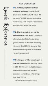 Practical Apologetic Use: When someone questions whether the Restoration is credible, point to specific fulfilled prophecies. For example, Joseph Smith’s 1834 claim about worldwide expansion wasn’t aspirational—it was prophetic. Encourage seekers to consider what kind of 24-year-old farm boy could predict global outcomes—unless he was guided by God.