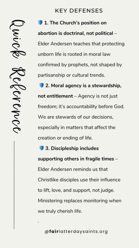 This claim oversimplifies and politicizes the Church’s doctrine. Elder Andersen teaches that cherishing life is a moral and spiritual principle, not a partisan agenda. The Church of Jesus Christ of Latter-day Saints opposes elective abortion for personal or social convenience—but it also allows for prayerfully considered exceptions (such as rape, incest, or when the mother’s life is in danger). Making blanket statements like “You can’t be a good Latter-day Saint if you support abortion in any case” risks weaponizing faith for political purposes. Gospel truth is not a tool for signaling party loyalty or moral superiority. Elder Andersen doesn’t call for judgment; he calls for ministering: “Our words, our hands, our hearts… can bless them to feel the Savior’s love.” To cherish life is not to condemn others. It’s to walk with them in their pain, offer support, and uphold life with compassion and clarity—not contention.