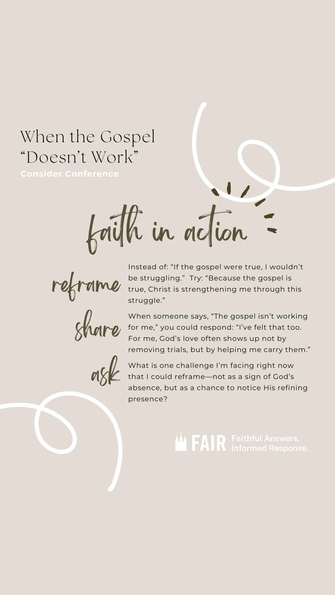 Some feel discouraged or even lose faith when they feel the gospel is “not working”. When health fails or hoped-for blessings never materialize, there’s a temptation to think that God has ‘let us down’. But this expectation rests on a counterfeit view of the gospel, one that measures God’s goodness by our comfort and success. President Eyring’s message answers that misconception: trials are not failures of the gospel but the very means by which it transforms us into Christlike beings.