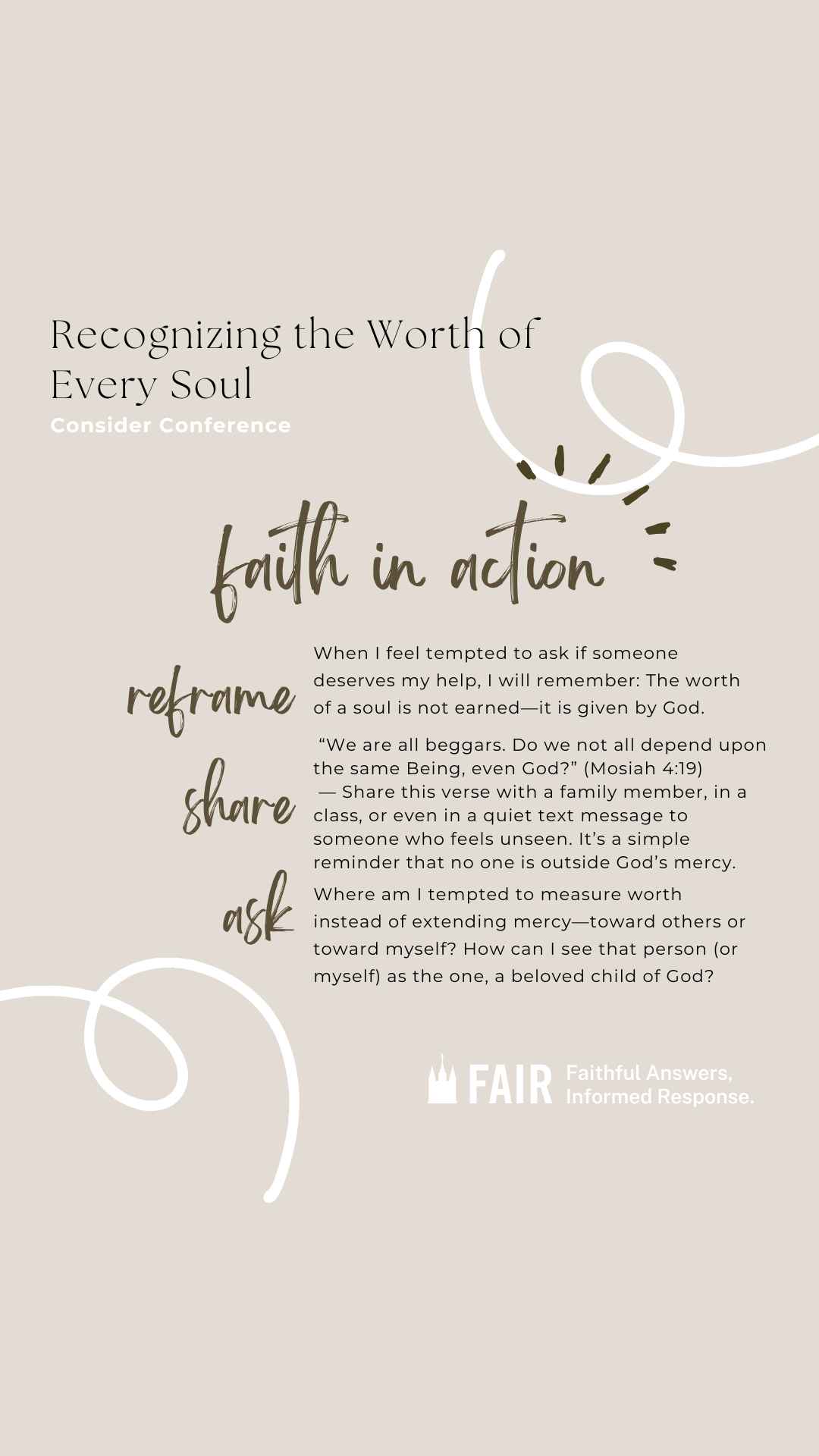 - Catch the judgment: When you find yourself thinking in categories—they brought it on themselves, they’re not like me, I don’t deserve help—pause and reframe: “We are all beggars before God” (Mosiah 4:19).