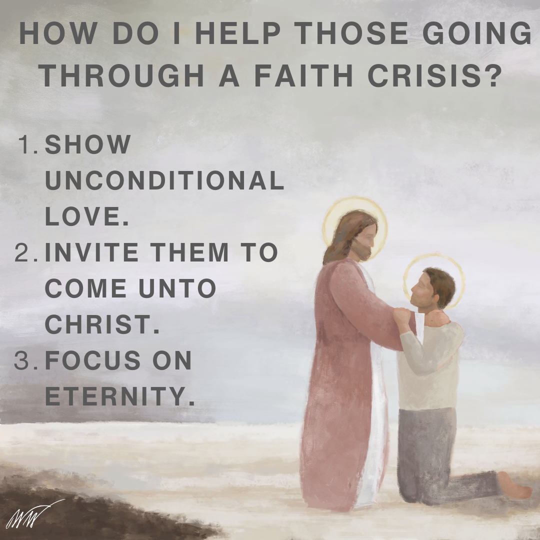 We can help our friends and family working through a faith crisis as we show unconditional love, invite them to come unto Christ, and focus on eternity.