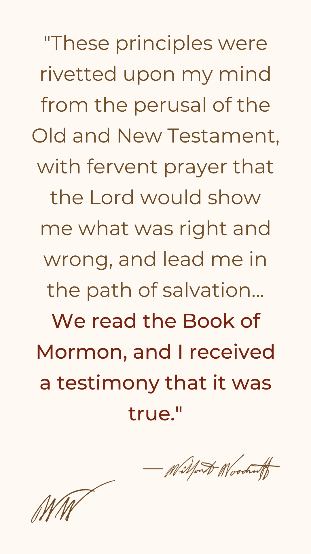 Wilford Woodruff, an early prophet of The Church of Jesus Christ of Latter-day Saints, was just 26 years old when he first heard of and read the Book of Mormon. He continually shared his testimony for the rest of his life. While Wilford never recorded the exact experience he had when learning of the Book of Mormon, he did record several actions he had taken previously to understand the will of God in his life. Speaking of the Church of Jesus Christ, he wrote: