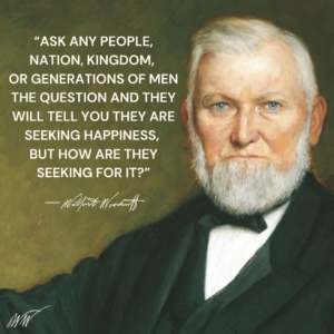 One question to reflect upon is, how are we seeking happiness? One of the promises of Jesus Christ is that as we seek, we can find (Matthew 7:7). Wilford Woodruff had an interesting perspective on this: “Ask any people, nation, kingdom, or generations of men the question and they will tell you they are seeking happiness, but how are they seeking for it?”
