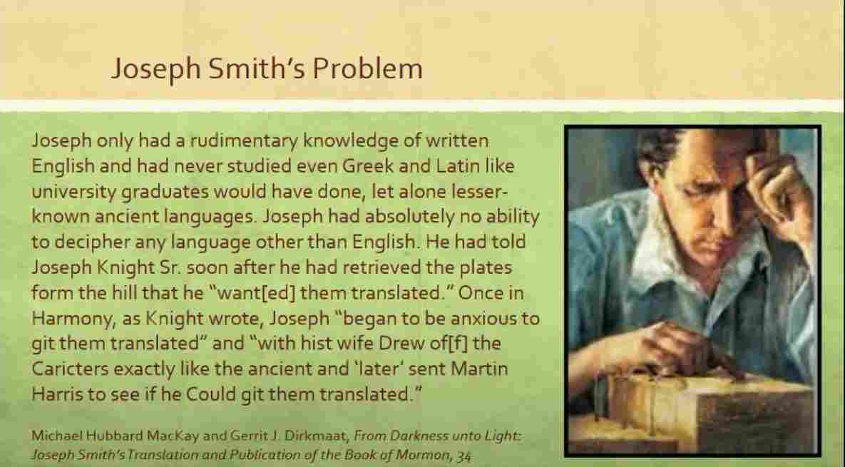 Joseph only had a rudimentary knowledge of written English and had never studied even Greek and Latin like university graduates would have done, let alone the lesser-known ancient languages. Joseph had absolutely no ability to decipher any language other than English.”