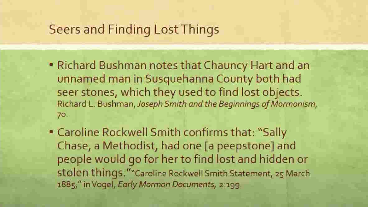 Richard Bushman notes that Chauncy Hart and an unnamed man in Susquehanna County both had seer stones, which they used to find lost objects.