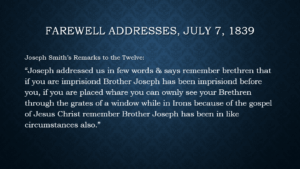 After Rigdon, Joseph Smith spoke on a similar topic — the potential imprisonment and injustice the missionaries might face while preaching in England. Joseph alluded to the circumstances he had endured while imprisoned in Missouri, saying: