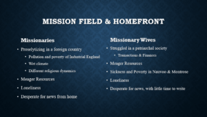 These women realized firsthand the poverty Church members were facing and made do as well as they could. They avoided asking for additional assistance from Church leaders. Perhaps the women considered it their Christian duty to suffer in silence. Part of their commitment to the gospel and their husbands’ missionary labors.