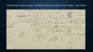 Each of the fathers sent kisses to their children, instructing their wives to kiss them on their behalf. Likewise, the wives and children sent their kisses and well wishes to their husbands and fathers. In one letter, Lenora Taylor had each of their three children kiss the paper. She circled and labelled each as a kiss from that child.