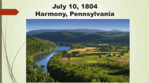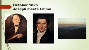 When Emma meets him, Joseph Smith and his father are hired to go to Harmony, Pennsylvania, with the idea that both of them will participate in some kind of treasure hunting activity. For Joseph Smith, he will then meet Emma in October of 1825 there in the vicinity of Harmony.