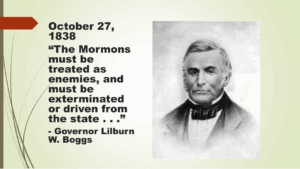 Part of the difficulty had much to do with this man Lilburn W. Boggs, who was the governor of the state of Missouri. On October 27, 1838, he issued the extermination order. This indicated that the Mormons must be treated as enemies and must be exterminated or driven from the state.