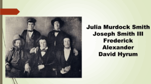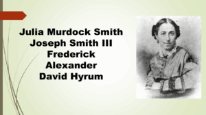 Well, what happened to her children? Julia Murdoch Smith has a pretty tumultuous life and ended up being buried in the Catholic cemetery in Nauvoo. Joseph Smith III, Alexander, and David become leaders of the Reorganized Church. Frederick died in his 20s.