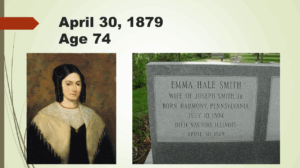 For Emma, she will die on April 30th, 1879. She will die at age 74. The place that she dies is what we today call the Nauvoo House, spoken of in section 124. Back then they called it the Bidamon House. She dies; she’s on the second floor. Her family is gathered around her, her sons Alexander and Joseph. One of her last words that she calls out is “Joseph.”