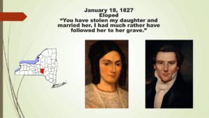 Joseph and Emma don’t have a “church wedding.” We know that they will elope and will cross over state lines into New York. Isaac Hale was very unsatisfied with the elopement of his daughter to Joseph. He says on one occasion, “You have stolen my daughter and married her. I had much rather have followed her to her grave.” So for any of you that have difficulties with in-law problems, I’m sure that Joseph Smith would understand.