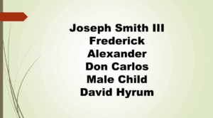 The other children go as follows: you’ve got Joseph Smith III. Joseph Smith III for 54 years will be president of the Reorganized Church of Jesus Christ of Latter-day Saints. Frederick will die in his 20s. For Alexander, he will live to be a member of the quorum of the Twelve, then of the Reorganized Church. Don Carlos died as a child. Then a male baby dies. Then David Hyrum Smith was born after the martyrdom of Joseph Smith. So what we now know about Emma is that if you were to look at her family and the children she was able to raise, you’d say, “Emma, your oldest child is Julia, right?” And then comes Joseph Smith III, Frederick, Alexander, and then last but certainly not least, David Hyrum Smith.