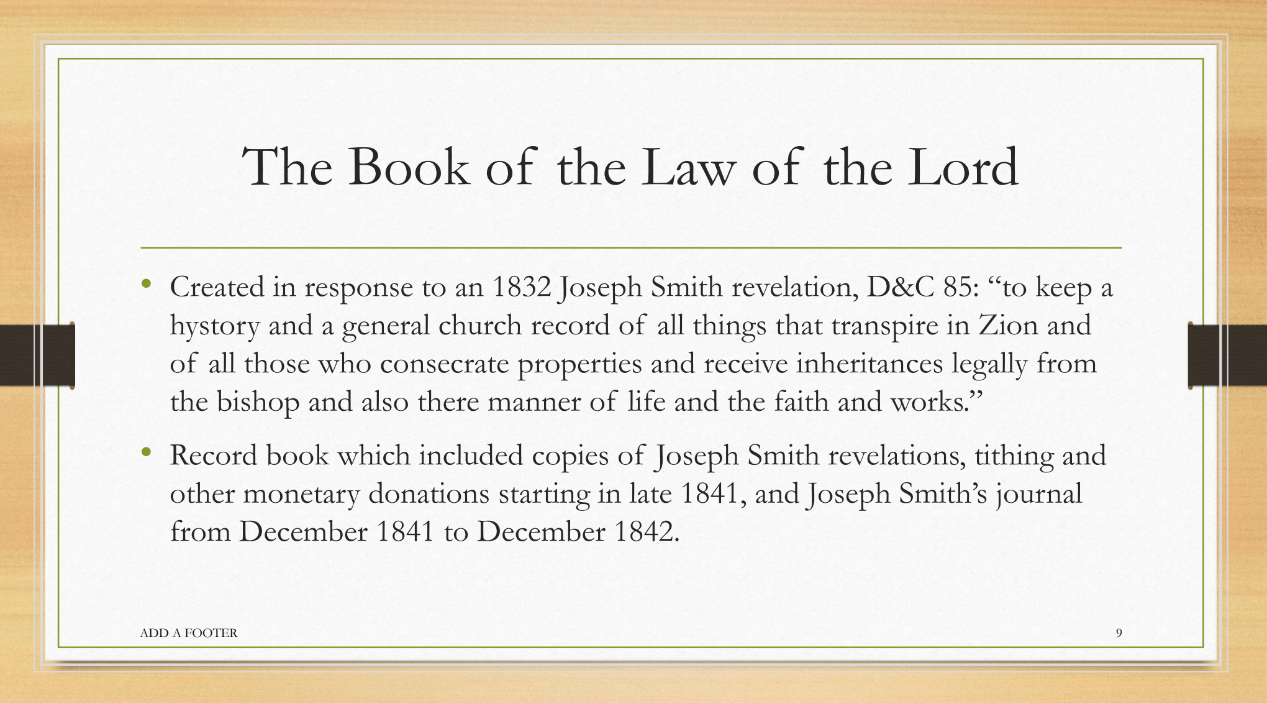 This expression of gratitude alone is instructive, that Joseph would turn his thoughts to his blessings in such a tumultuous time. But there is even greater significance to these blessings and reflections. They were recorded by William Clayton in a record book known as the Book of the Law of the Lord.