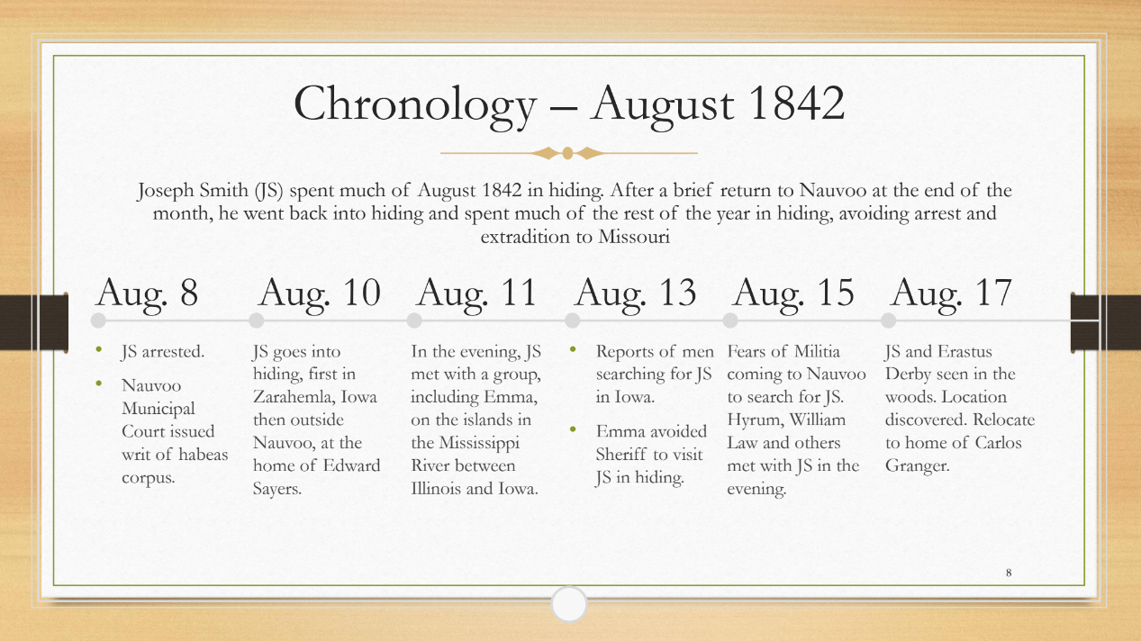 1842 was a busy year filled with significant changes and trials. You can see from the chronology of the summer shown here just how much Joseph was doing over these months. And May 1842 was an especially defining month in Joseph Smith’s life.