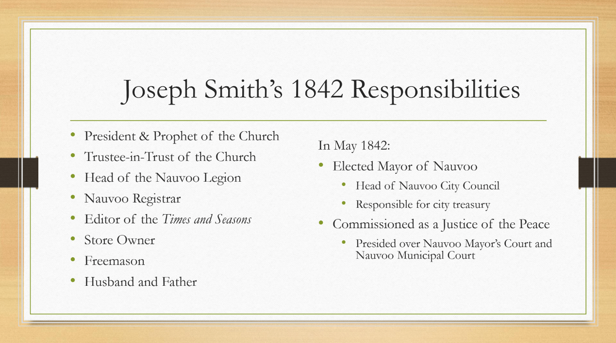 - Historical context: Focus on May–August 1842 during Joseph Smith’s life in Nauvoo.