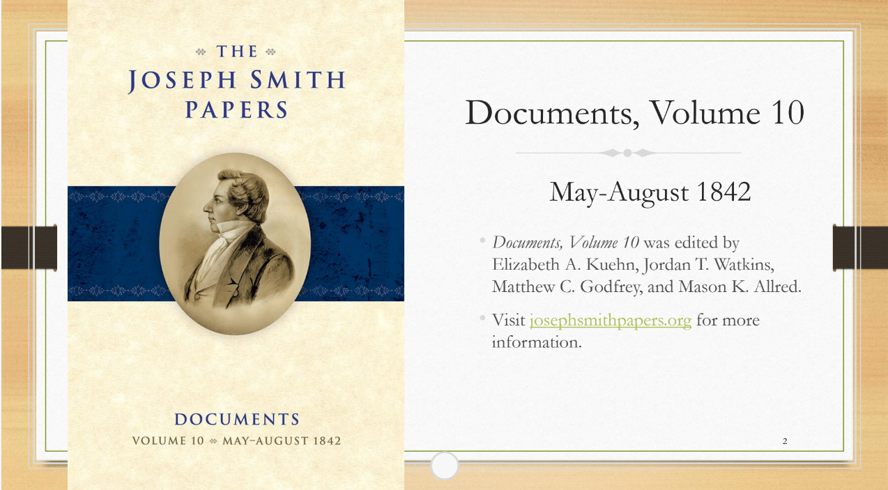 My presentation today is relevant and, I hope, timely for multiple reasons. For one thing, I am excited to focus my remarks today on the most recently published volume of the Joseph Smith Papers, Documents Volume 10, which covers the period from May to August 1842. I served as lead editor on this volume and was fortunate to work with a wonderful team of historians and editors. In all of the challenges of the past months, I would not be surprised if this volume slipped your notice when it was released in May. But I hope to highlight today some of the insights found in its pages about the life and character of Joseph Smith.