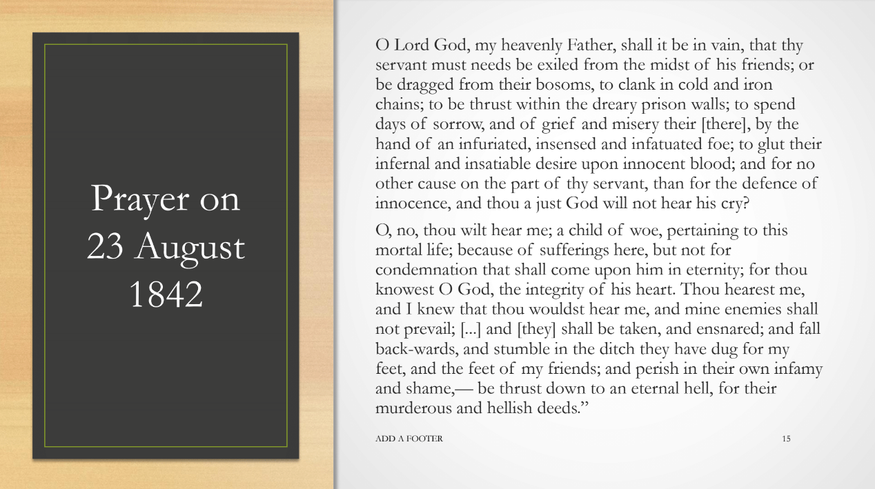 O Lord God, my heavenly Father, shall it be in vain, that thy servant must needs be exiled from the midst of his friends; or be dragged from their bosoms, to clank in cold and iron chains; to be thrust within the dreary prison walls; to spend days of sorrow, and of grief and misery their [there], by the hand of an infuriated, insensed and infatuated foe; to glut their infernal and insatiable desire upon innocent blood; and for no other cause on the part of thy servant, than for the defence of innocence, and thou a just God will not hear his cry? O, no, thou wilt hear me; a child of woe, pertaining to this mortal life; because of sufferings here, but not for condemnation that shall come upon him in eternity; for thou knowest O God, the integrity of his heart. Thou hearest me, and I knew that thou wouldst hear me, and mine enemies shall not prevail.”[50]