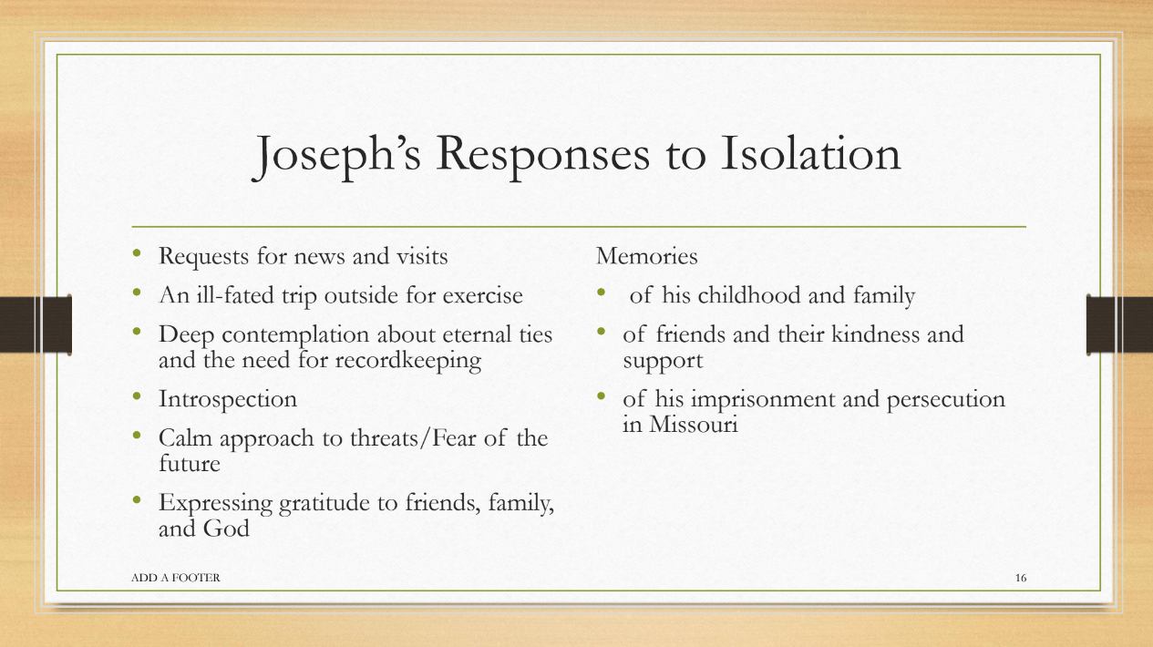 My presentation today will contextualize the summer of 1842 and the developments that led Joseph Smith to go into hiding for first weeks, then months as well as the challenges he and the Saints faced at this time. It will also highlight the different ways Joseph reacted to his time in isolation, placing particular emphasis on the blessings he dictated and the gratitude he expressed. My hope is that we can all find some aspect of this to relate to or learn from, especially in our current circumstances.