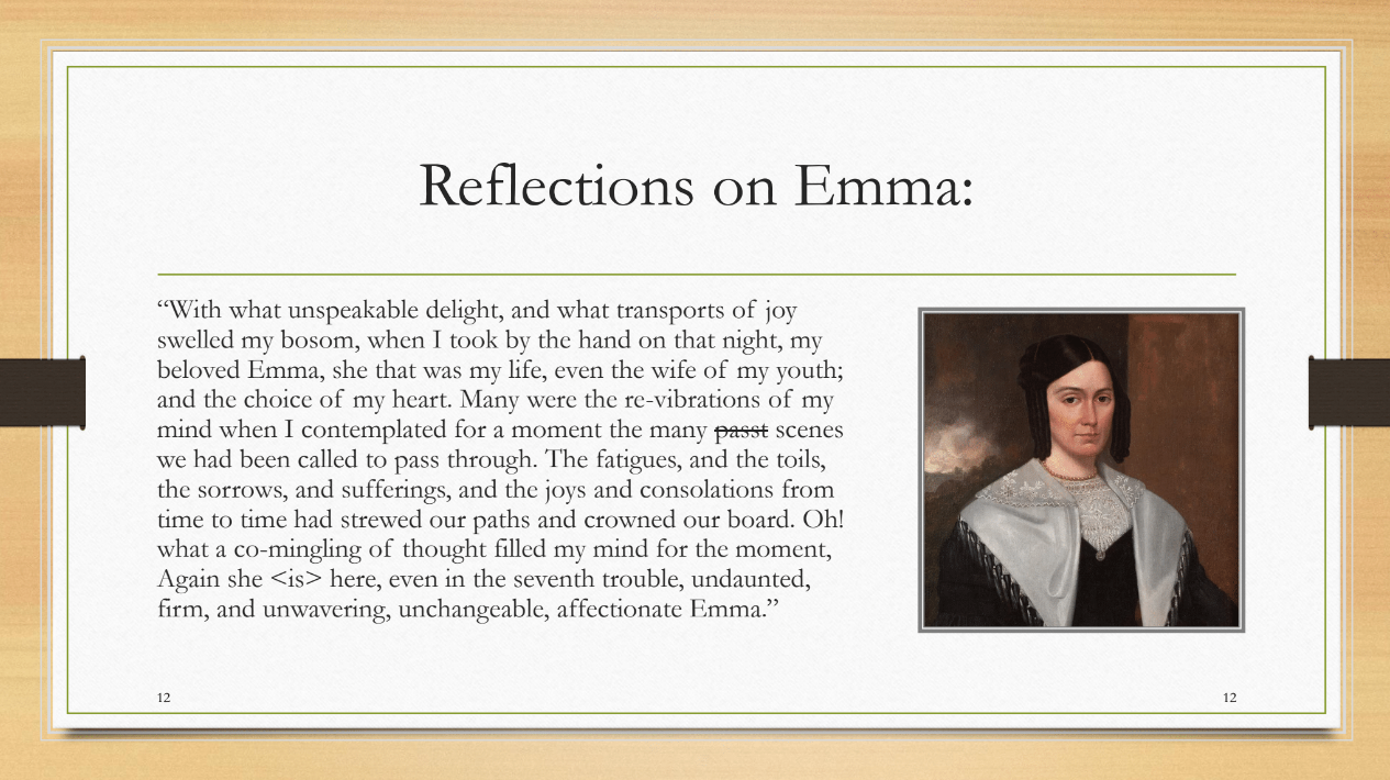 With what unspeakable delight, and what transports of joy swelled my bosom, when I took by the hand on that night, my beloved Emma, she that was my life, even the wife of my youth; and the choice of my heart. Many were the re-vibrations of my mind when I contemplated for a moment the many passt scenes we had been called to pass through. The fatigues, and the toils, the sorrows, and sufferings, and the joys and consolations from time to time had strewed our paths and crowned our board. Oh! what a co-mingling of thought filled my mind for the moment, Again she <is> here, even in the seventh trouble, undaunted, firm, and unwavering, unchangeable, affectionate Emma.”[38]