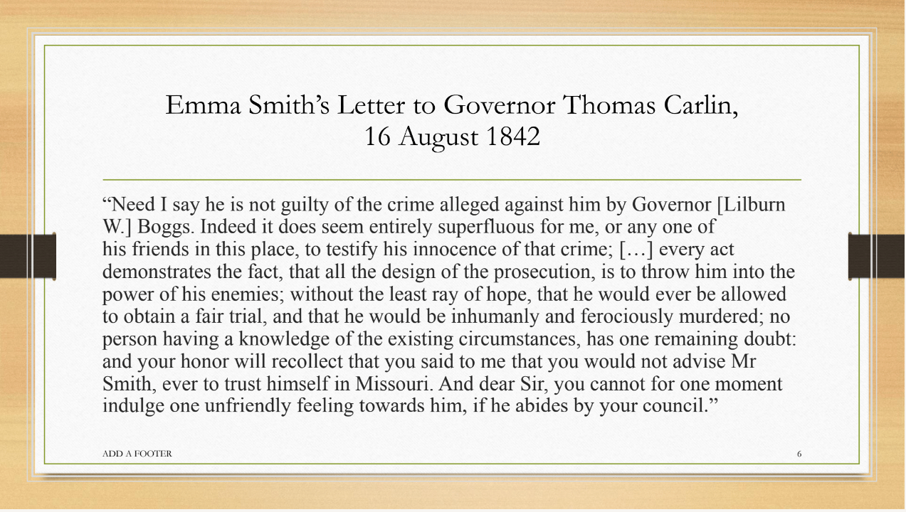 It was perhaps Emma Smith who best encapsulated the situation in her August 16, 1842 letter to Governor Carlin. She decried the injustice the Latter-day Saints, and particularly her husband, had endured at the hands of Boggs and other Missouri officials. She pled for Carlin’s sympathy and then reminded him of the realities that Joseph faced, writing