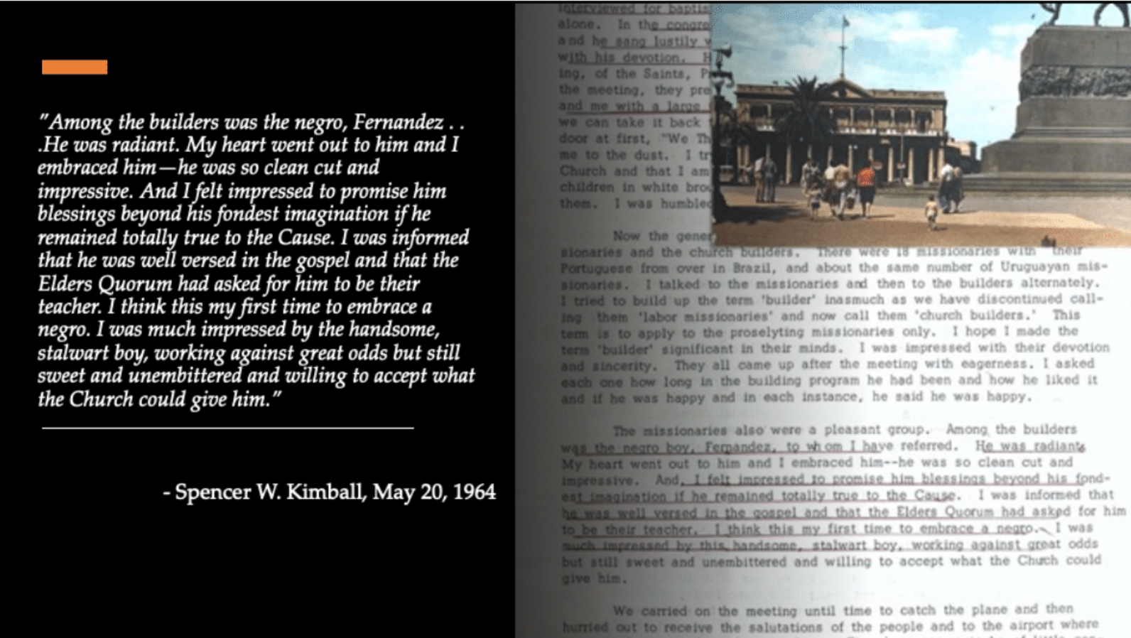 Spencer W. Kimball, who was a member of the Twelve at the time, immediately began to make regular visits to members throughout Latin America. During his travels, he frequently encountered faithful Black members of the Church and was impressed by their dedication. While traveling in Uruguay in 1964, Kimball and his traveling companions stopped at a meetinghouse construction site where ”Church builders,” local members who were called as missionaries specifically to build meetinghouses, were working.
