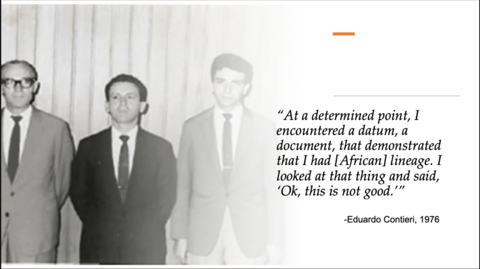 “At a determined point, I encountered a datum, a document, that demonstrated that I had [African] lineage. I looked at that thing and said, ‘Ok, this is not good.’” Contieri had discovered a picture of a maternal grandmother who he had never known. The woman in the picture appeared black to Contieri.