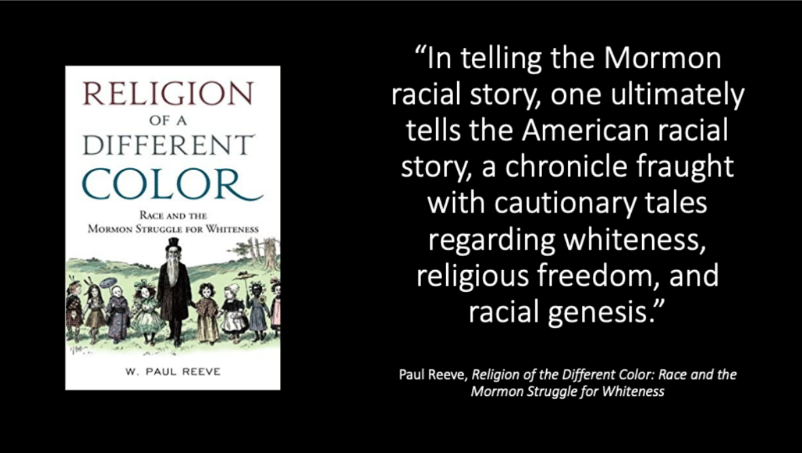 “In telling the Mormon racial story,” Reeve argues, “one ultimately tells the American racial story, a chronicle fraught with cautionary tales regarding whiteness, religious freedom, and racial genesis.” Five years ago, during the 2015 FairMormon Conference, Reeve in fact argued that throughout the second half of the nineteenth and early twentieth centuries, Church members were “attempting to claim a white and pure future” while others were “attempting to trap [them] in a racially suspect past.”