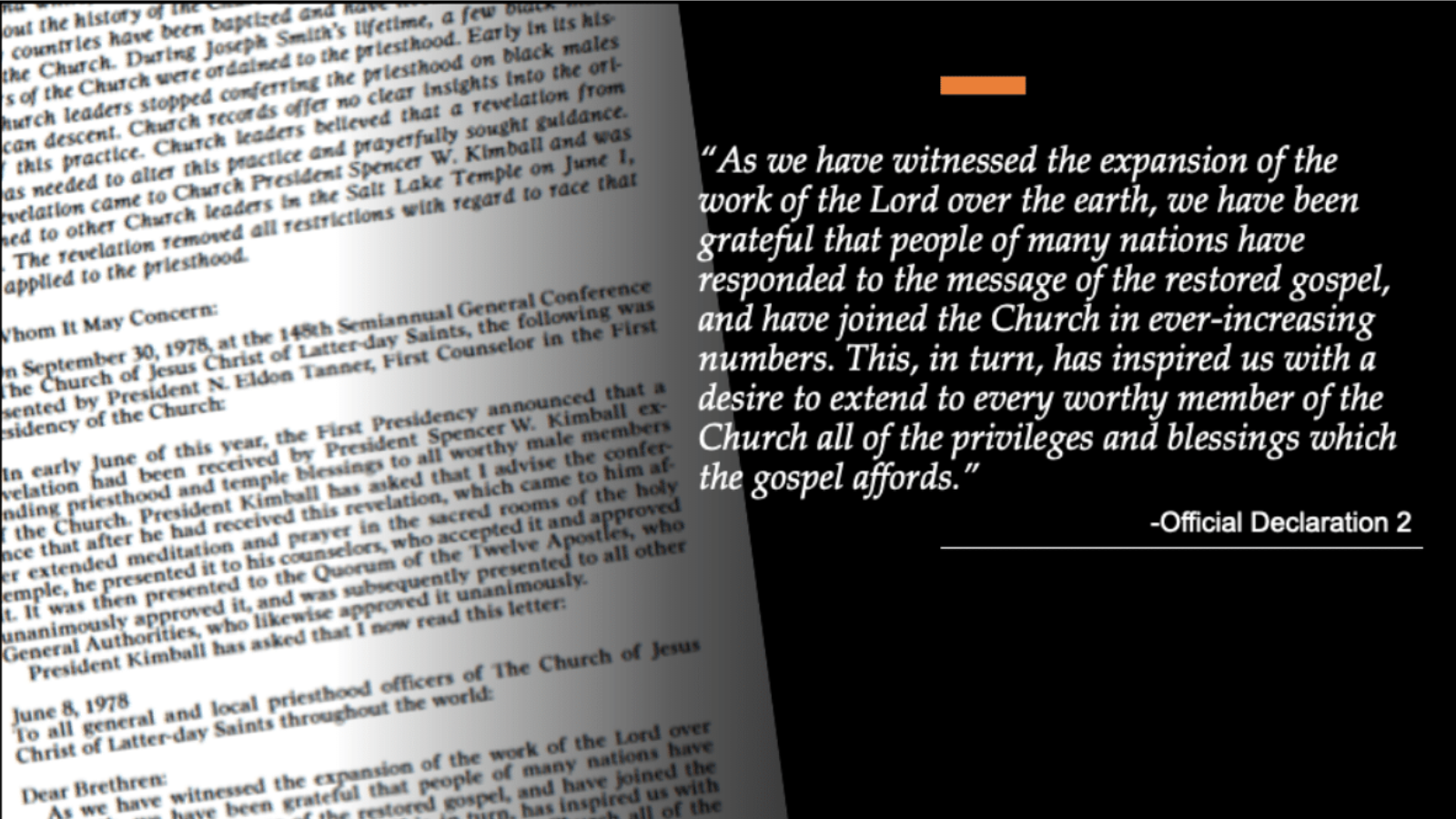 My hope for my remarks today is to show that the history of race within the Church is best understood when we consider the complexities of race relations globally. This perspective allows a better understanding of both the timing of the revelation in 1978 and offers insight for Church members as we attempt to move beyond past racial attitudes toward a more diverse and inclusive present.