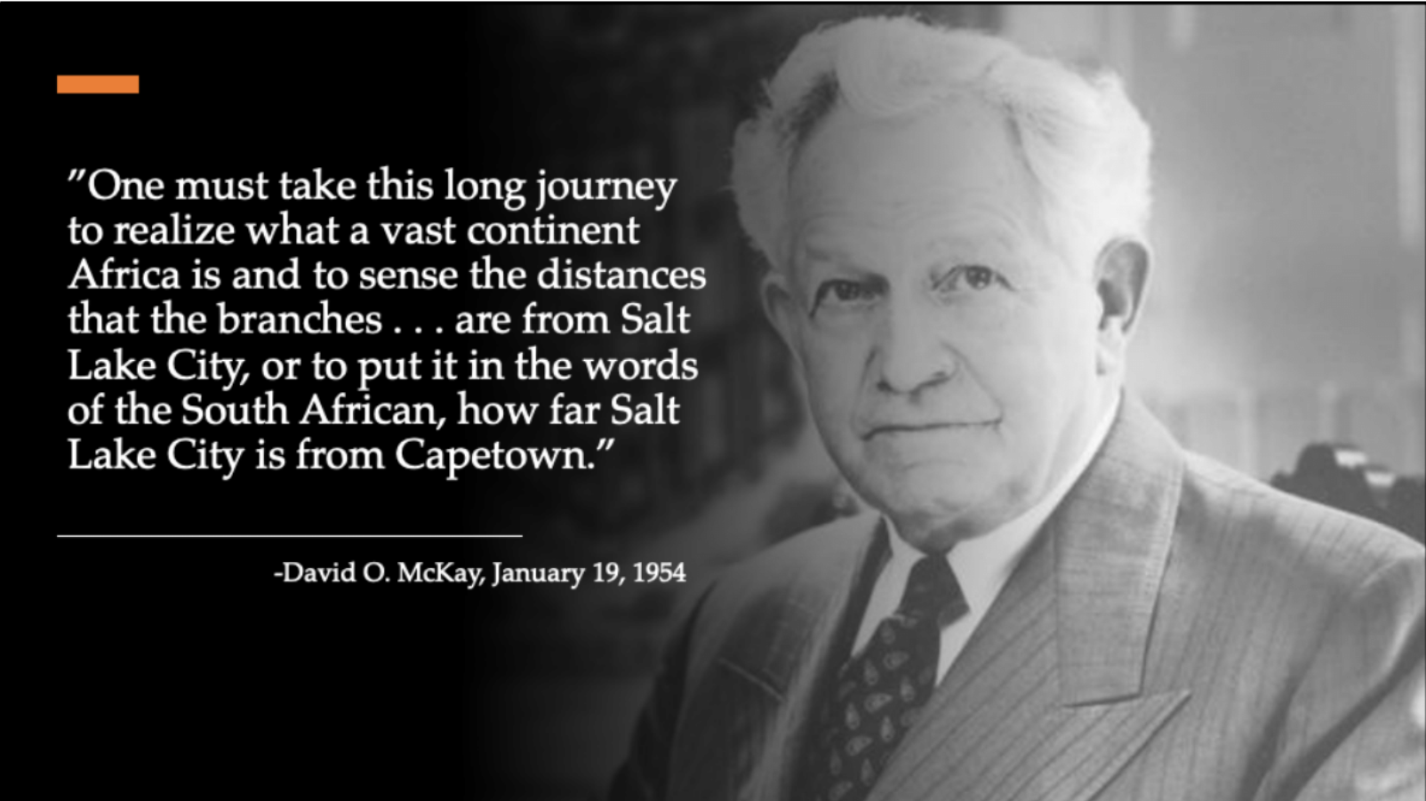 In 1954, while traveling in Latin America and South Africa, McKay was again impressed with the greater understanding that is afforded Church leaders when visiting members in their homelands. In a letter written while in South Africa, McKay reflected that “One must take this long journey to realize what a vast continent Africa is and to sense the distances that the branches . . . are from Salt Lake City, or,” he added, hearkening back to his lesson three decades earlier in Japan, “to put it in the words of the South African, how far Salt Lake City is from Capetown,” (as quoted in Prince and Wright, David O. McKay and the Rise of Modern Mormonism, 373).