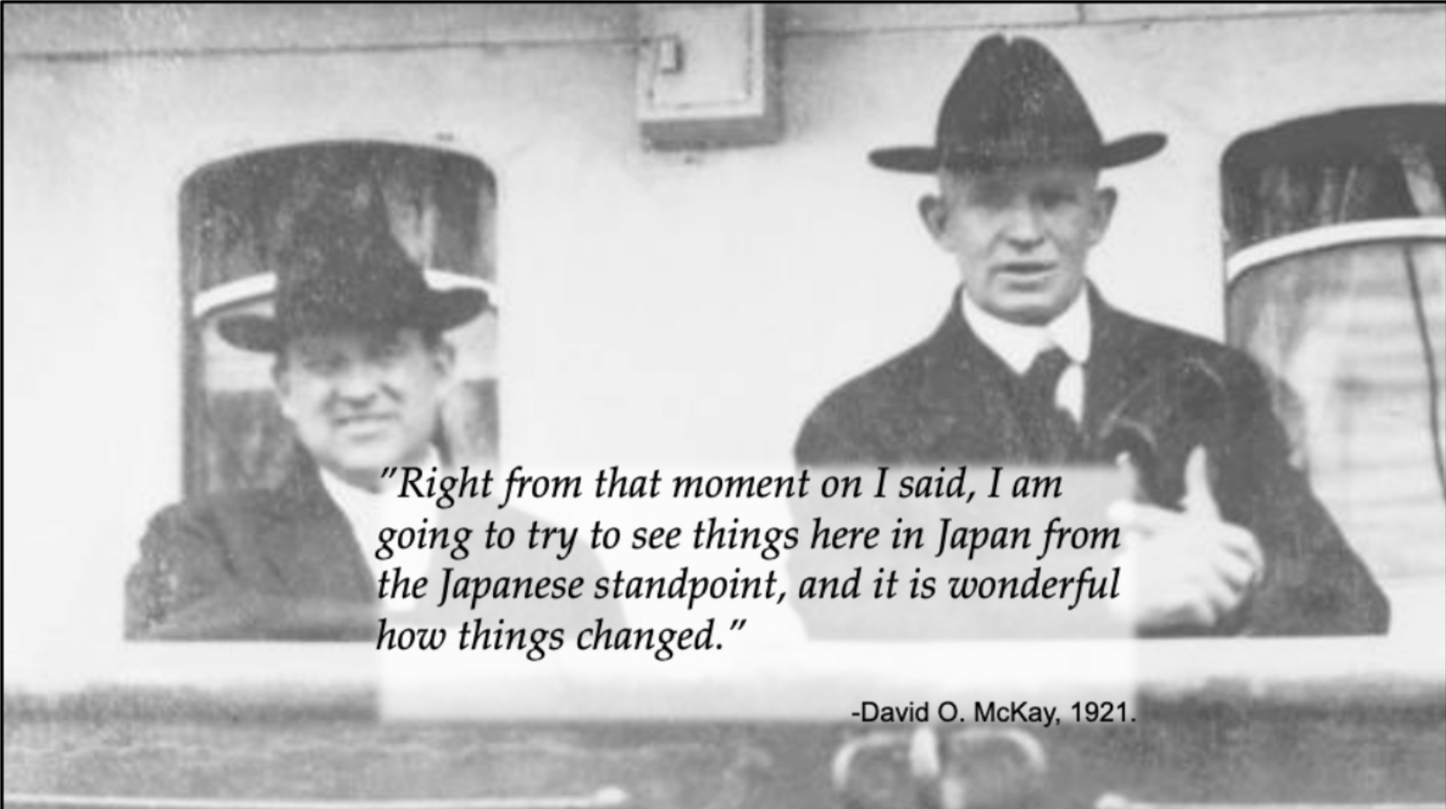 After one lunch appointment where he inadvertently offended his gracious host, McKay determined to approach his encounters with other cultures with more empathy. “Right from that moment on I said, I am going to try to see things here in Japan from the Japanese standpoint, and it is wonderful how things changed.” This lesson impacted the remainder of McKay’s life and ministry as an apostle and eventually as Church president (see Gregory Prince and Wm. Robert Wright, David O. McKay and the Rise of Modern Mormonism [Salt Lake City: University of Utah Press, 2005], 371).