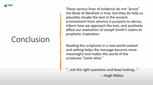 Like I said, we’re never going to prove the Book of Abraham is true. And that’s not what I’m doing here tonight. But we can ask good questions. We can evaluate it based on the evidence we have. And we can keep looking for more. All the while being assured from a spiritual witness that the scriptures are true, and complementing that with these academic resources and evidences.