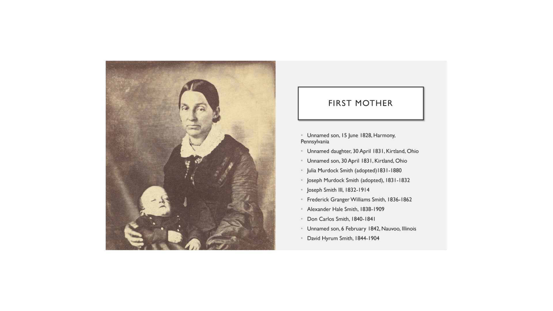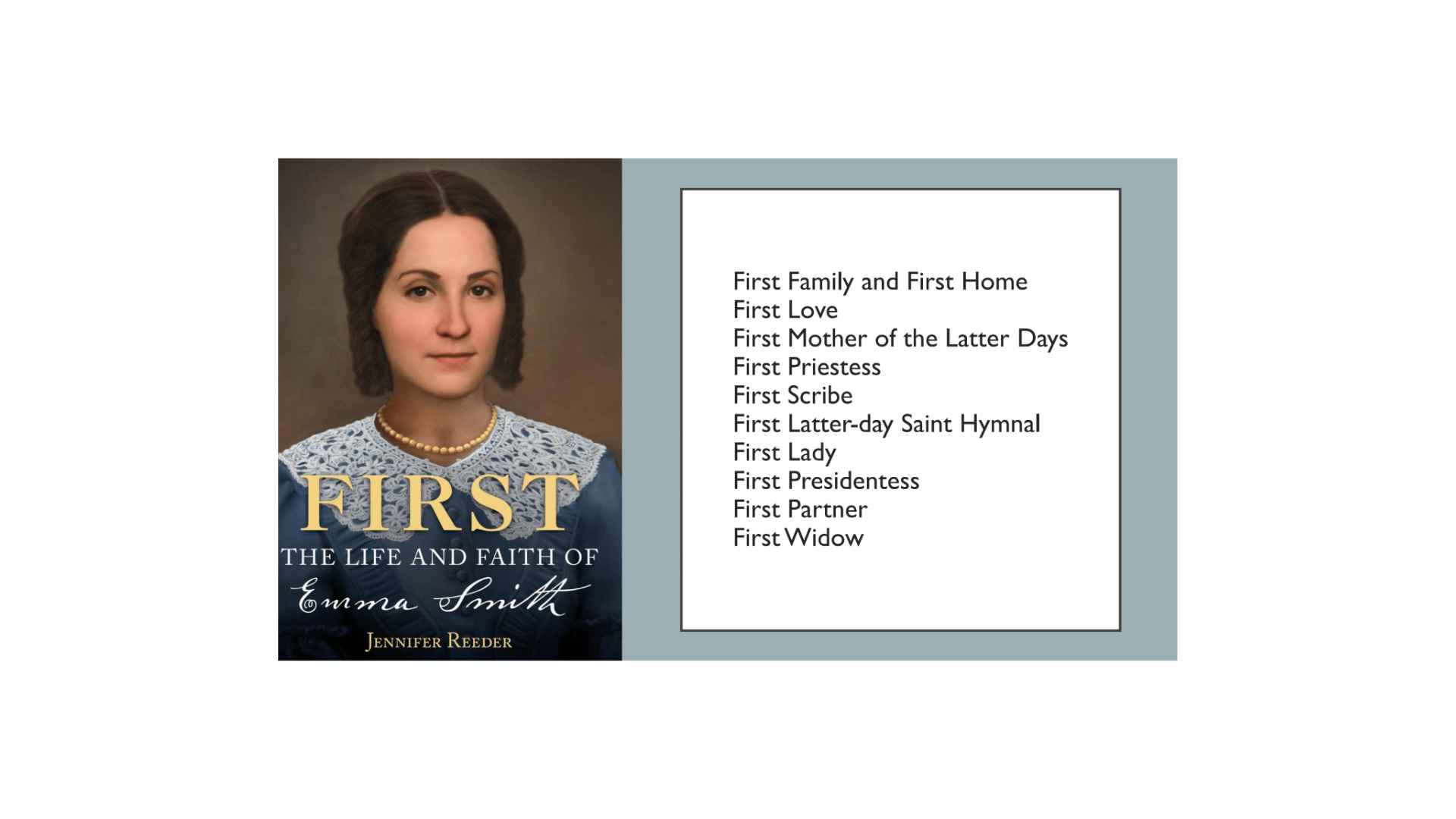 Right before Emma passed away, she told her nurse about a dream where Joseph came to her and brought her to a beautiful mansion. There, in a nursery, she found her son Don Carlos, who had died as a toddler. Joseph promised her that she would soon have all of her children; they would all be at or as one. She then turned around and saw Jesus Christ. She had indeed entered his presence; that line from Section 25 was fulfilled. “This is my voice unto all.” I think the Lord is saying to all of us, “This is Emma, my daughter who wears my crown and has entered my presence.” And yet we too are all firsts in this continual restoration. Thank you.