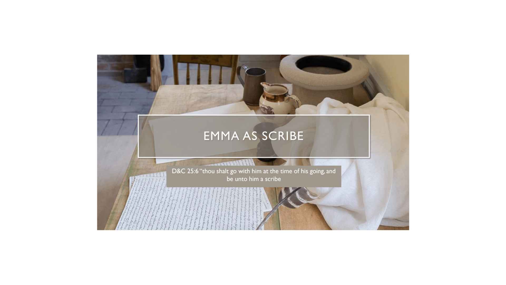 I just want to point out this is a picture of the site at the Joseph and Emma Smith home in Harmony, and Mark Staker, who’s a co-worker of mine in the Church History Department, talked about how when he was putting this all together, he knew they used a turkey quill for a pen, and he couldn’t find a turkey quill. He found something similar on eBay that he could put in the display, but it just wasn’t right. He prayed about it, and the next morning he went out on the doorstep, he was in Pennsylvania, and what was on the doorstep? A turkey feather. So, there it is. If you go there, you can tell that story.