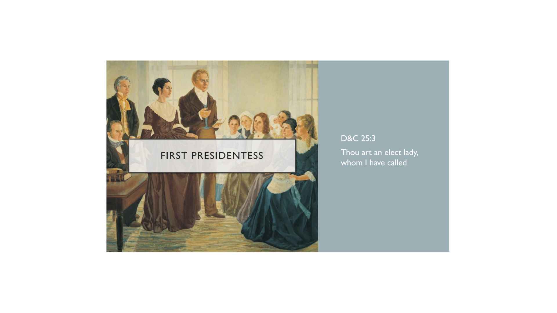 Do you see that progression? This transition from being a daughter in Zion to a daughter of God connects the community, or Zion, with deity. Section 25 presents an important pattern. The Lord defines His relationship with Emma based on her faith or belief, then gives her specific assignments, both what to do and what not to do, then deepens His relationship with her by promising her a crown of righteousness and an invitation into His presence.