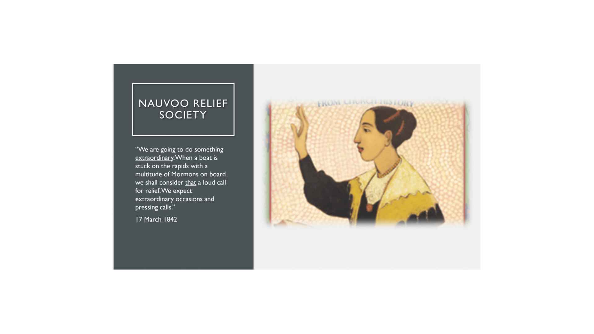 Emma privately exhorted and blessed her Relief Society sisters. Elizabeth Durfee recounted how President E. Smith and counselors Cleveland and Whitney had administered to her after the previous meeting and that she was healed. Emma also exhorted publicly. At the first Relief Society meeting she remarked, “We are going to do something extraordinary. We expect extraordinary occasions and pressing calls.” The excitement that built up from such powerful potential drew more and more women each meeting to seek membership. She made it cool to serve.