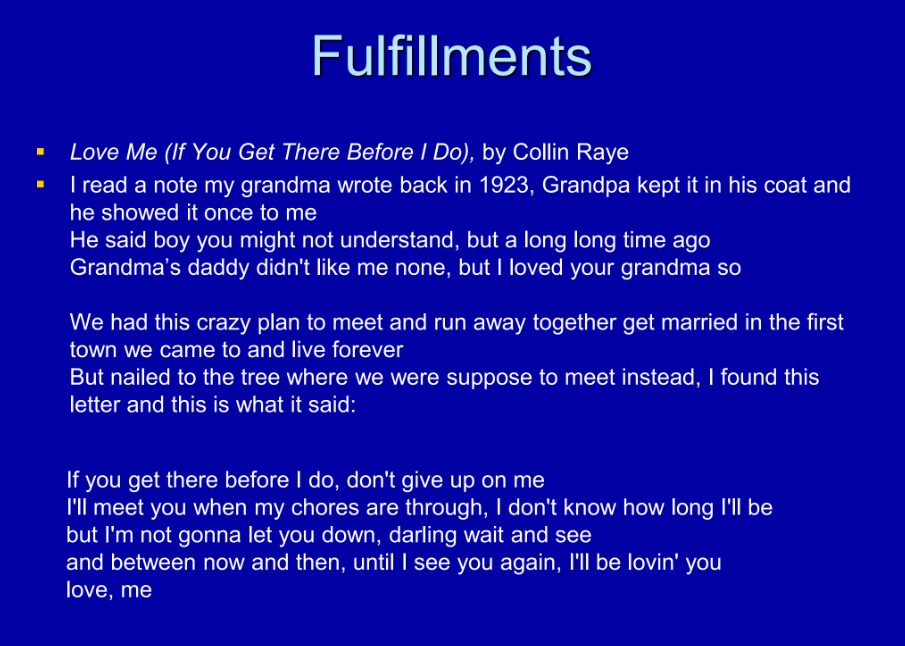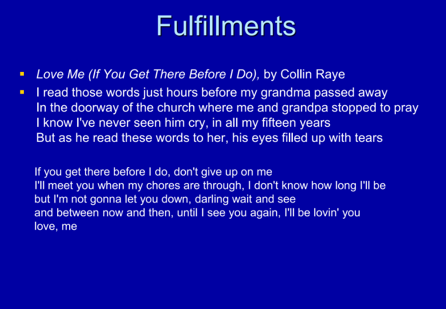 All right, so yeah, I don’t know why you’re laughing, but anyway, okay. As we look at this, we’re going to read from a song called “Love Me,” usually called “If You Get There Before I Do” by Colin Ray. All right, and I’ll just read this to you: