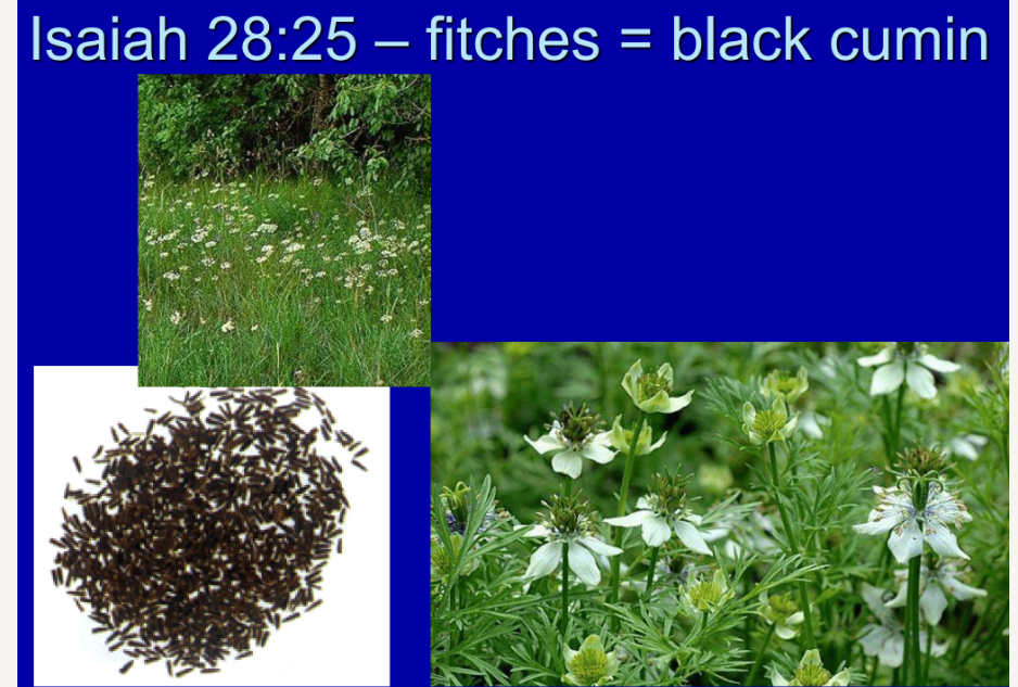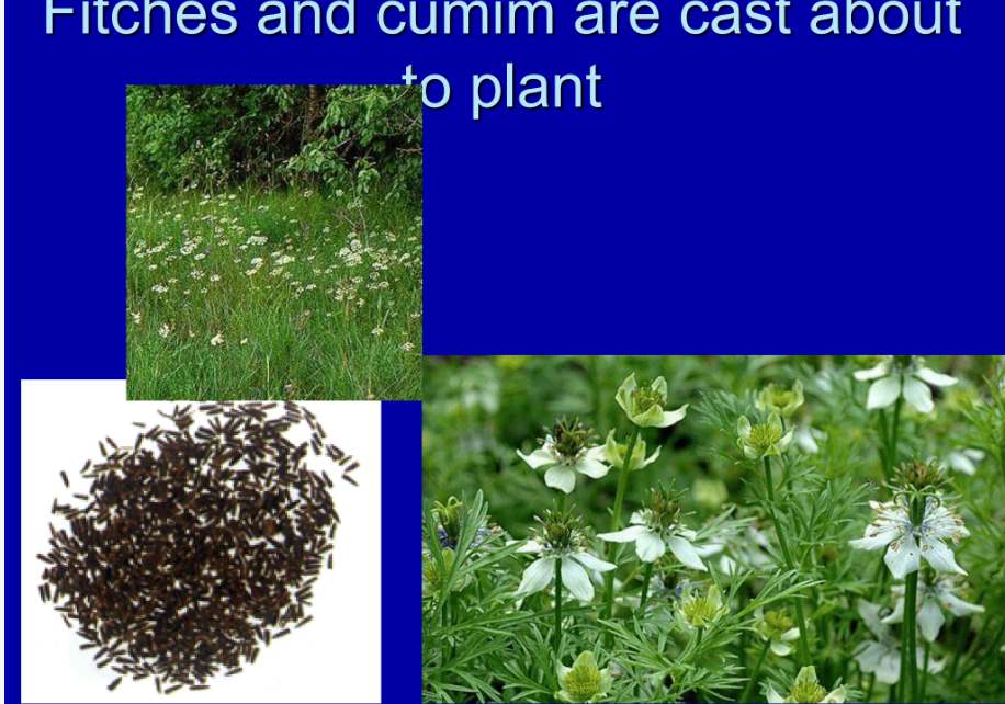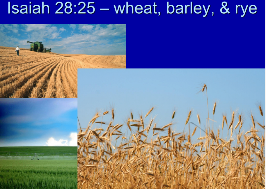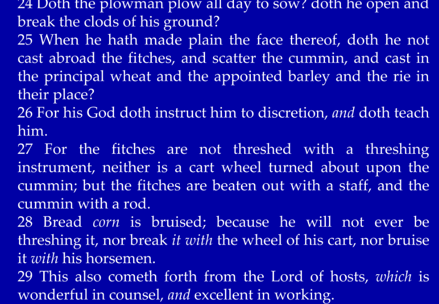 Now, I ask myself, what kind of imagery is he using? Here are some other examples where he talks about the plowman who plows differently for fitches and cummin than for breadcorn. In verse 27, he explains that fitches are not threshed with a threshing instrument, nor is a cart wheel turned about upon the cummin. Fitches are beaten with a staff, and cummin with a rod. On the other hand, breadcorn is bruised, and so on. He discusses both planting and threshing differently.